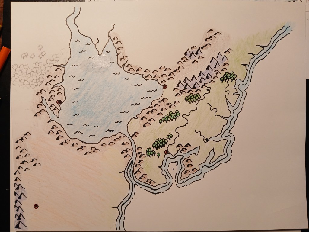 Coloring in the map was enjoyable. I still want to add more features, trees, hills, and other items of interest. I’m really happy with my results so far. Any advice and suggestions are appreciated!